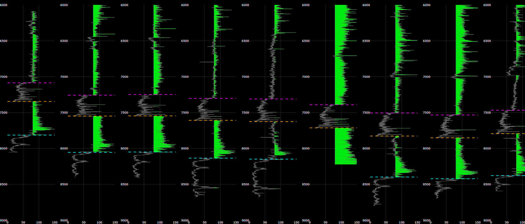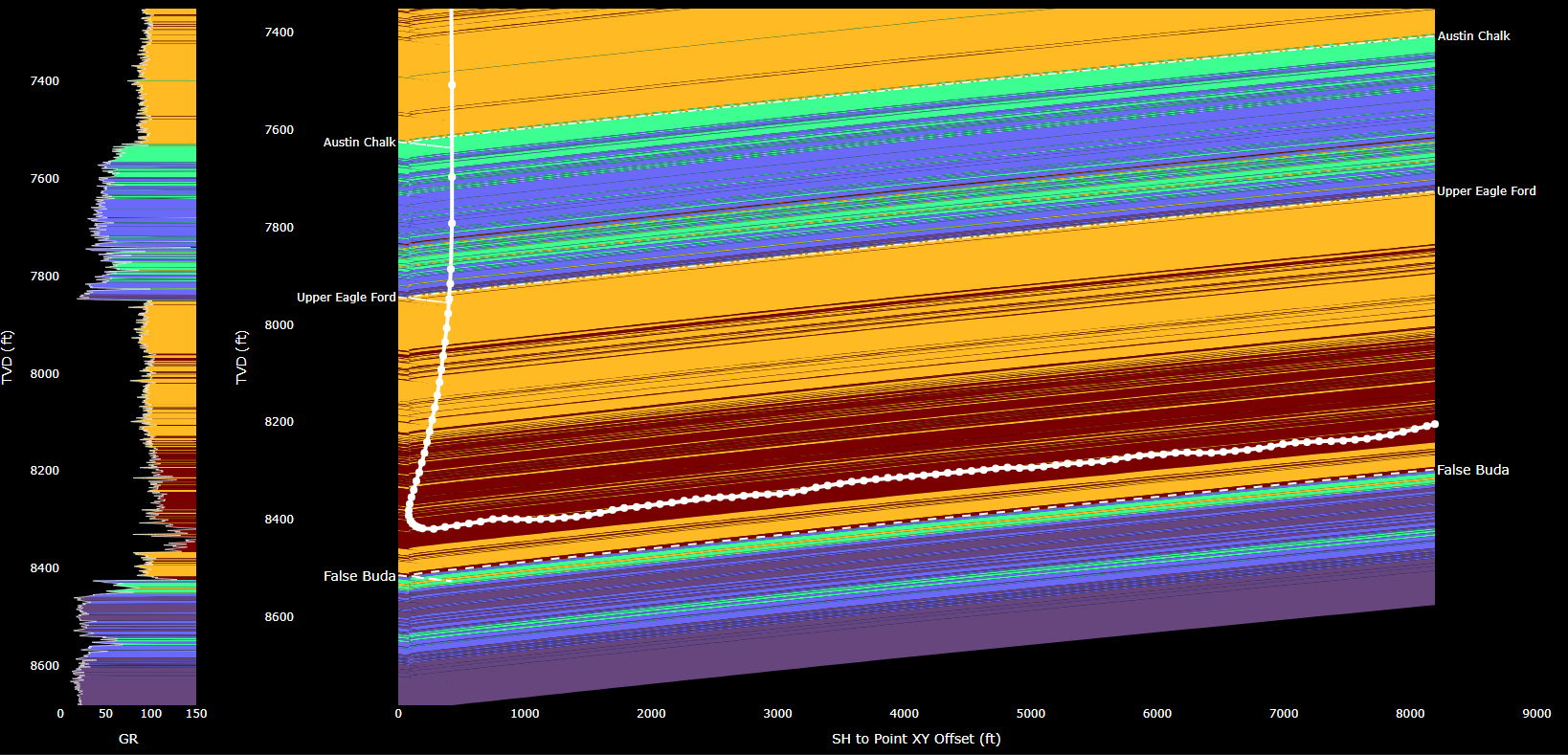 Use grid surfaces and nearby .LAS data to gain an even better picture of wellbore traversal through actual stratigraphy.